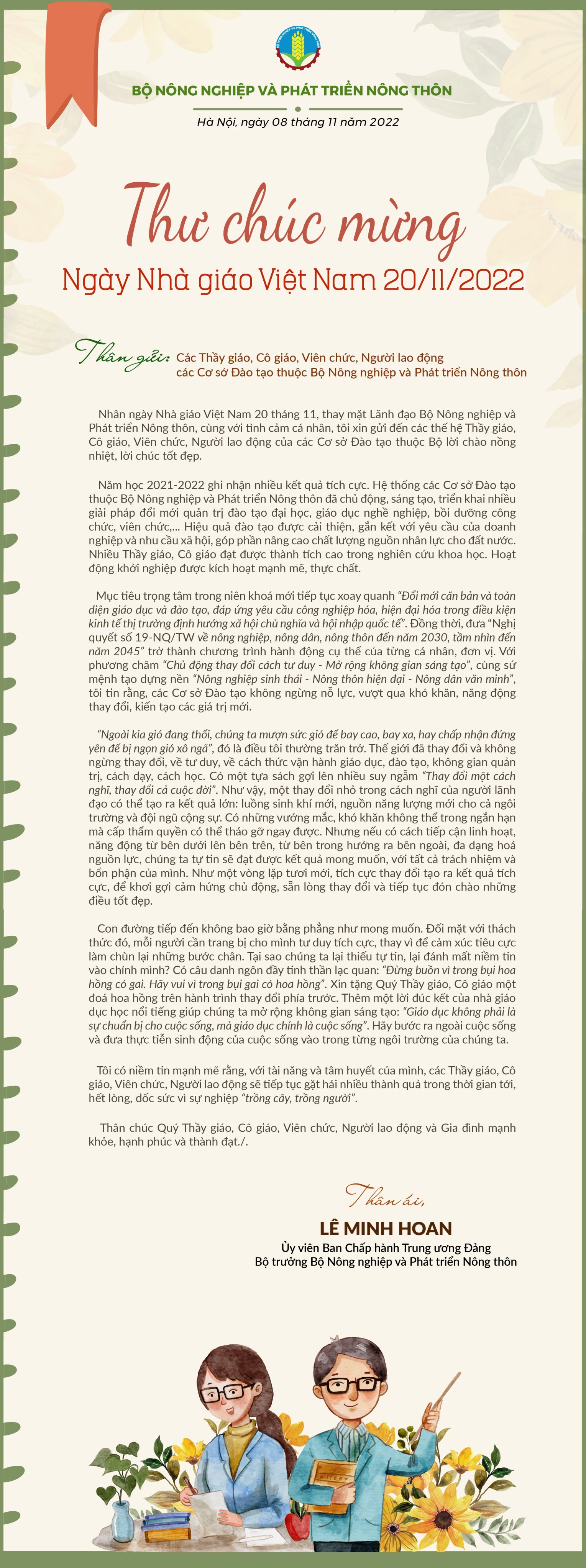 Thư chúc mừng ngày Nhà giáo Việt Nam 20/11 của Bộ trưởng Bộ NN&PTNT