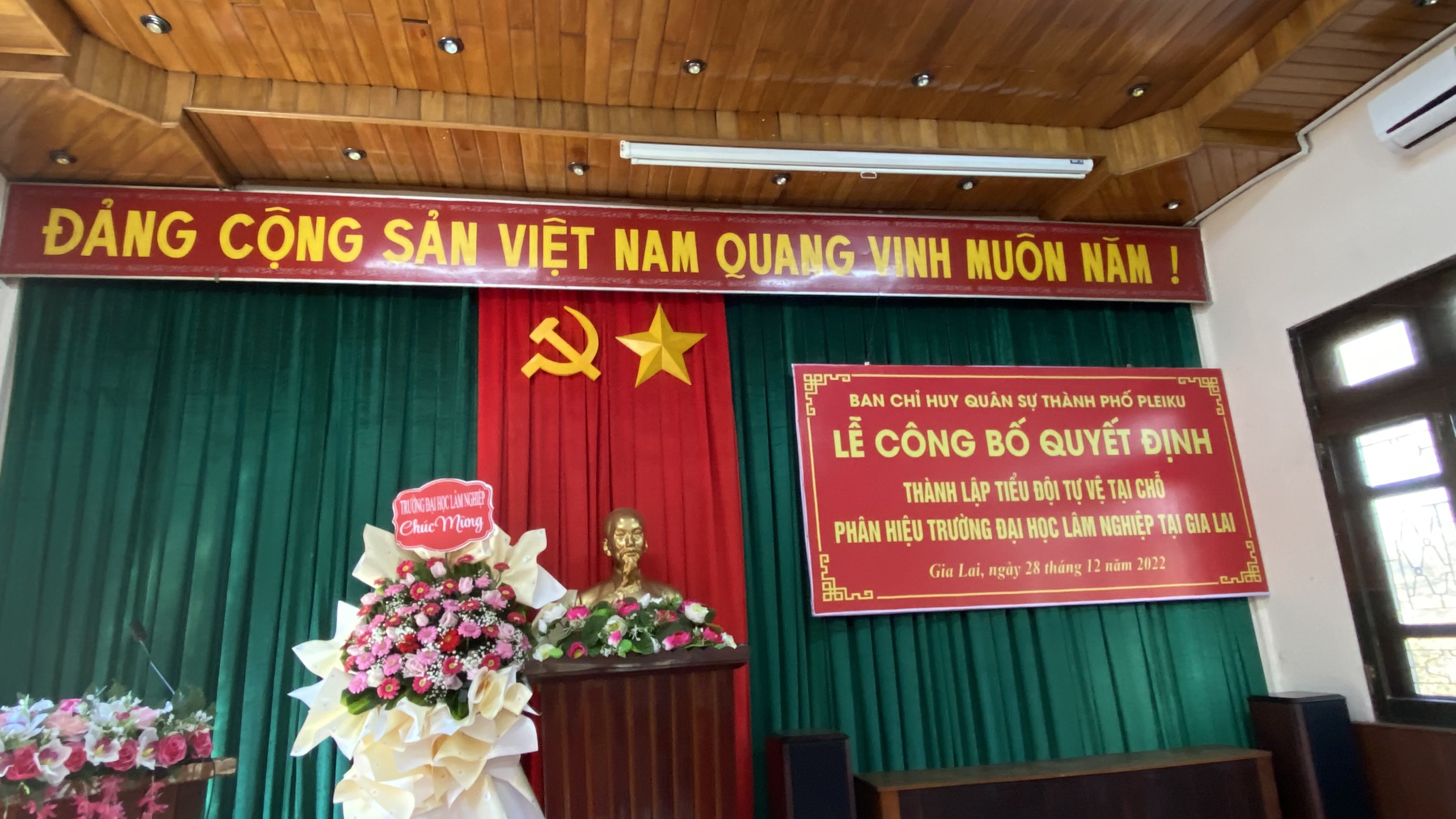 Thực hiện Quyết định số 1461/QĐ-BCH ngày 21/12/2022 của Ban chỉ huy quân sự thành phố Pleiku về việc thành lập Tiểu đội tự vệ tại chỗ Phân hiệu Trường ĐHLN tại tỉnh Gia Lai, sáng 28/12/2022, Phân hiệu Trường ĐHLN tại tỉnh Gia Lai đã tổ chức “Lễ công bố Quyết định thành lập và ra mắt Tiểu đội tự vệ”, nhằm tăng cường lực lượng tự vệ phối hợp với công an, dân quân và lực lượng chức năng có liên quan của thành phố Pleiku góp phần giữ vững an ninh chính trị, trật tự an toàn xã hội ngay tại Phân hiệu và khu vực.