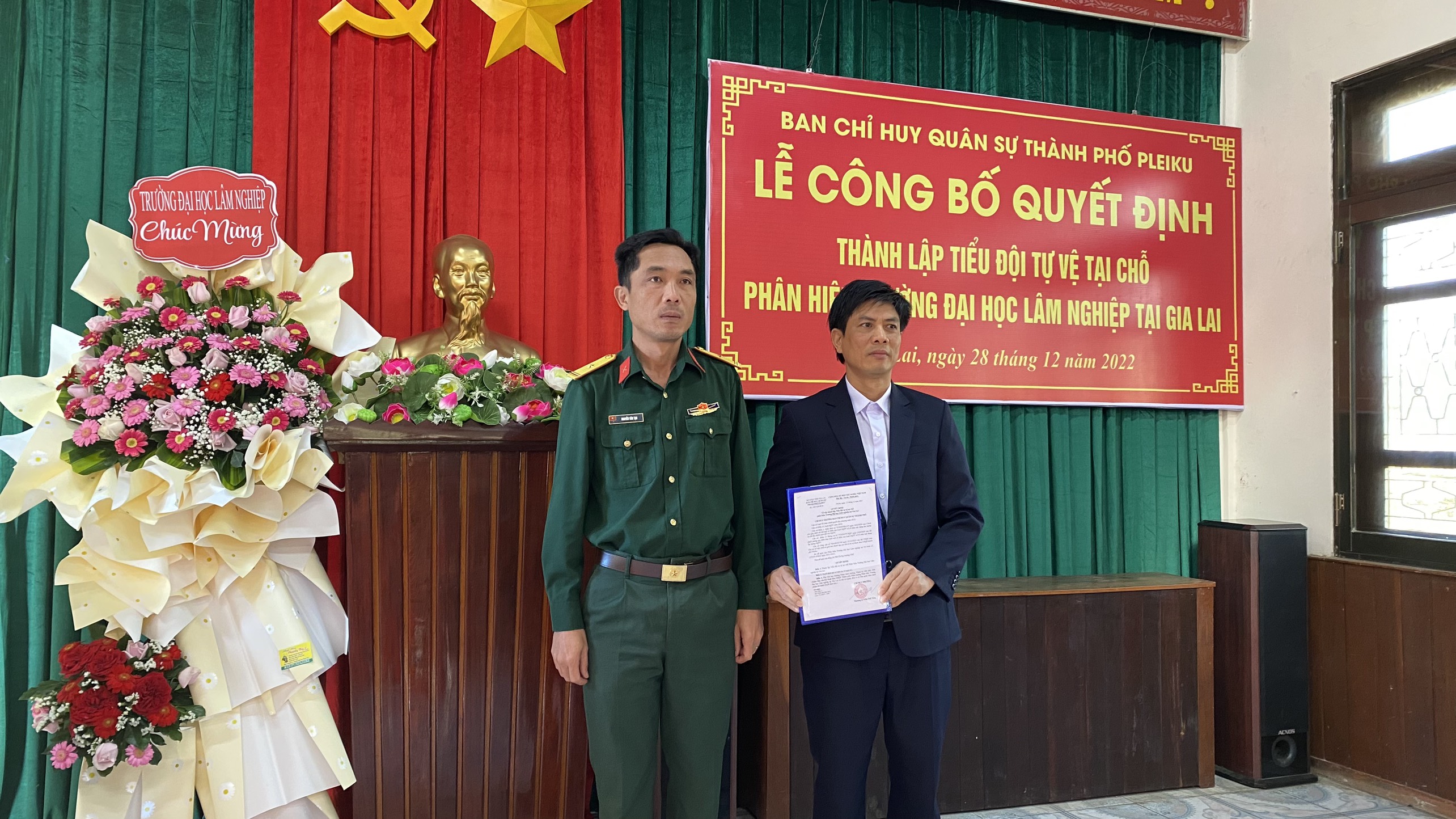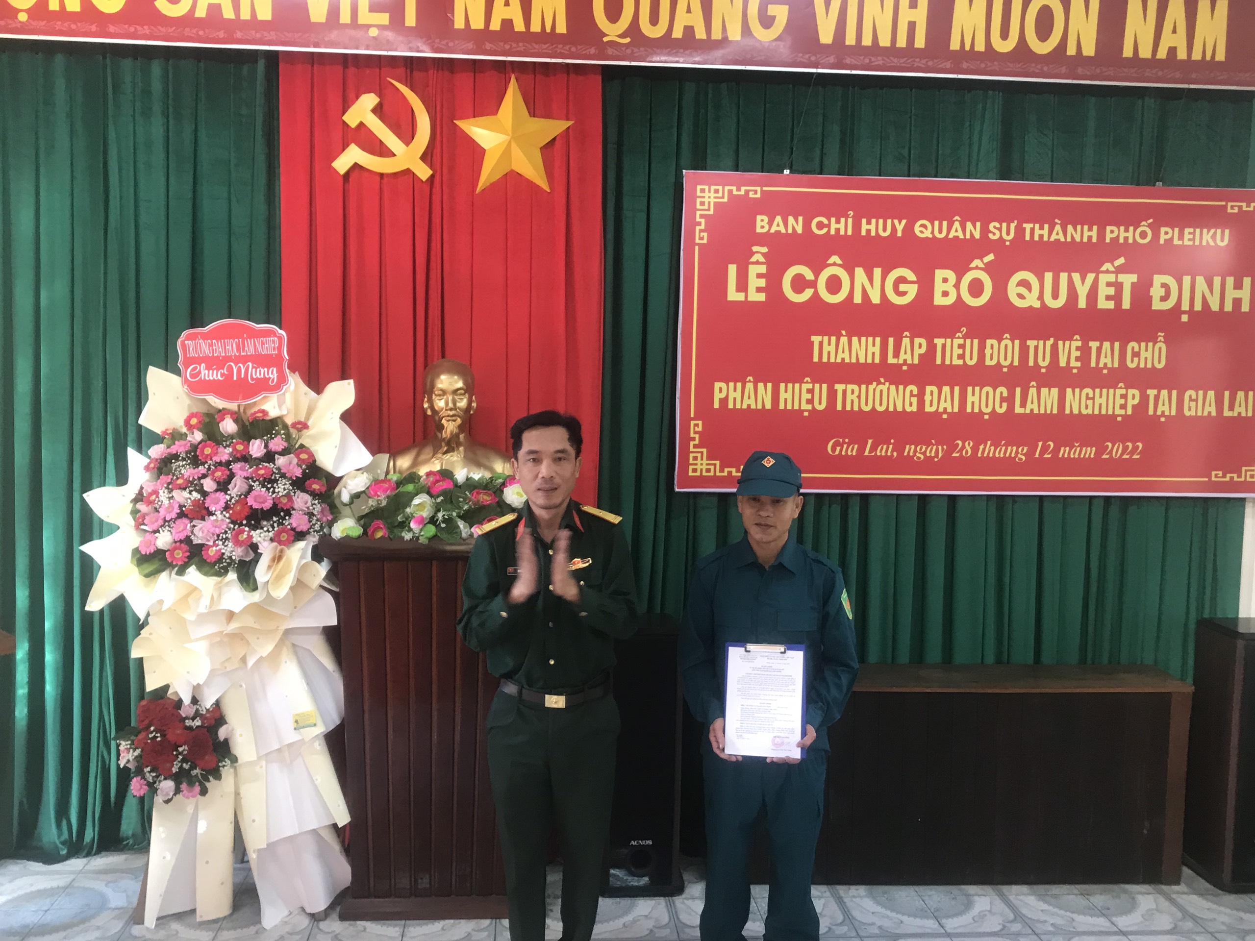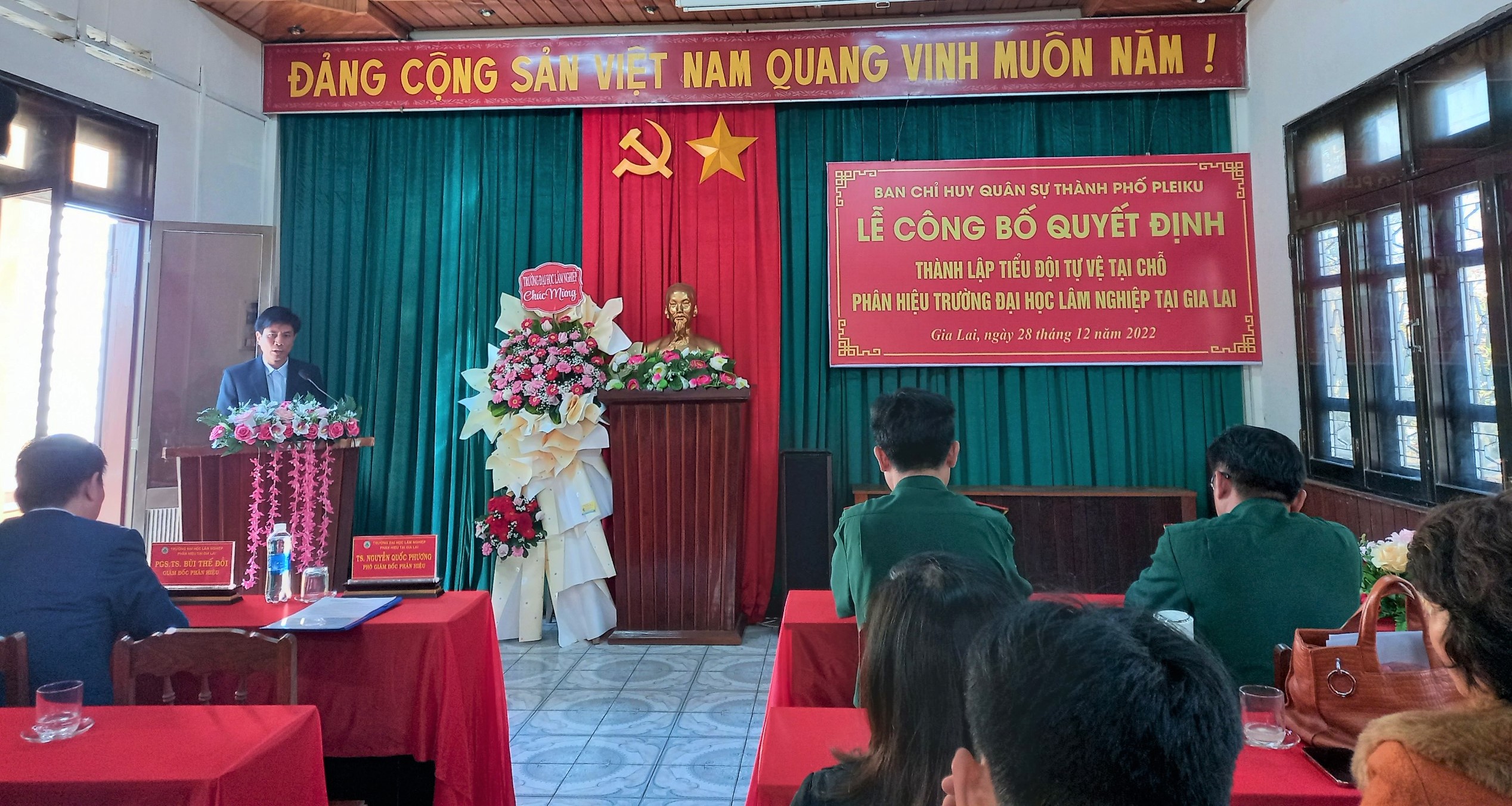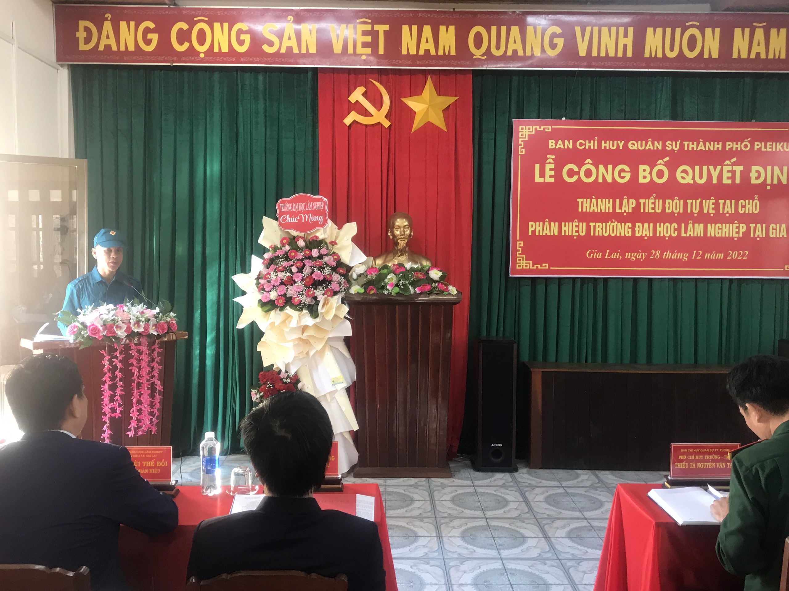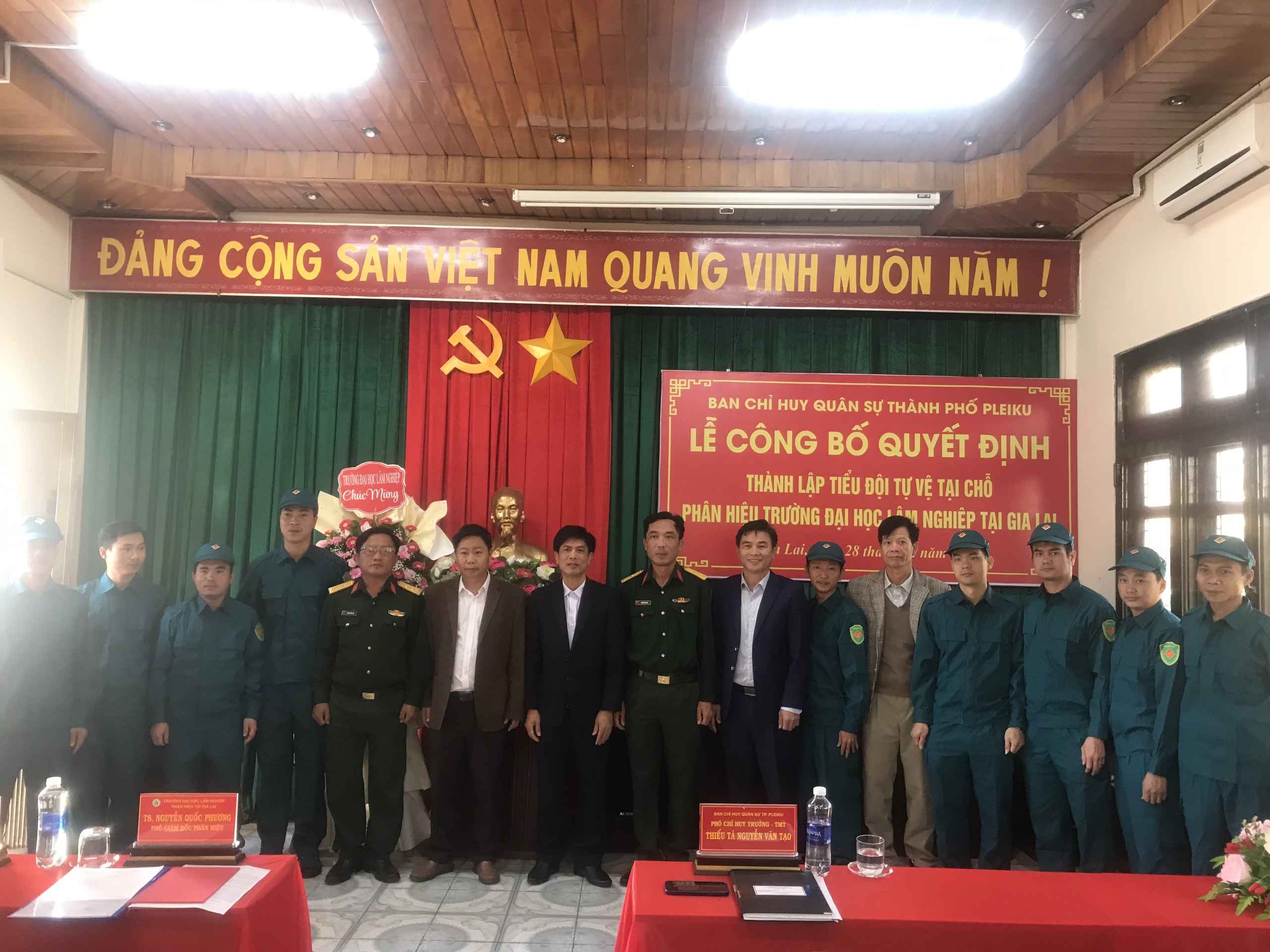Mở đầu chương trình, Thiếu tá Nguyễn Văn Tạo, Đảng ủy viên, Phó Chỉ huy trưởng, Tham mưu trưởng Ban CHQS Thành phố Pleiku đã công bố và trao Quyết định thành lập và Quyết định bổ nhiệm chức danh cho đồng chí Tiểu Đội trưởng Tiểu đội tự vệ Phân hiệu. Thiếu tá đã có phần phát biểu chỉ đạo, giao nhiệm vụ cho Tiểu đội tự vệ Phân hiệu Trường ĐHLN tại tỉnh Gia Lai.