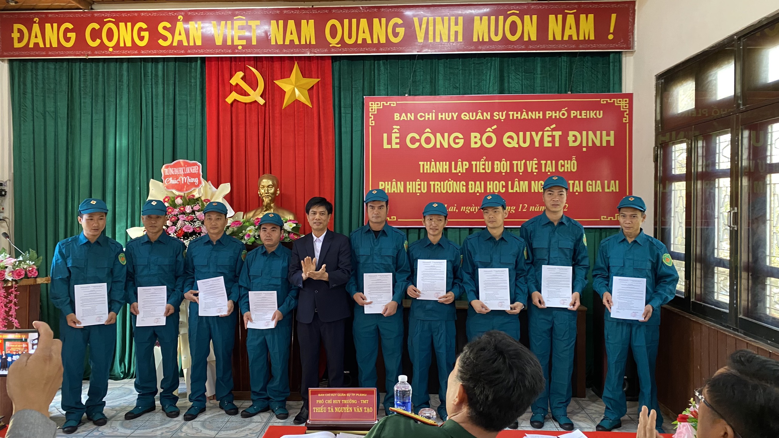 Thiếu tá Nguyễn Văn Tạo, Đảng ủy viên, Phó Chỉ huy trưởng, Tham mưu trưởng Ban CHQS Thành phố Pleiku đã trao Quyết định thành lập và Quyết định bổ nhiệm chức danh cho đồng chí Tiểu Đội trưởng Tiểu đội tự vệ Phân hiệu