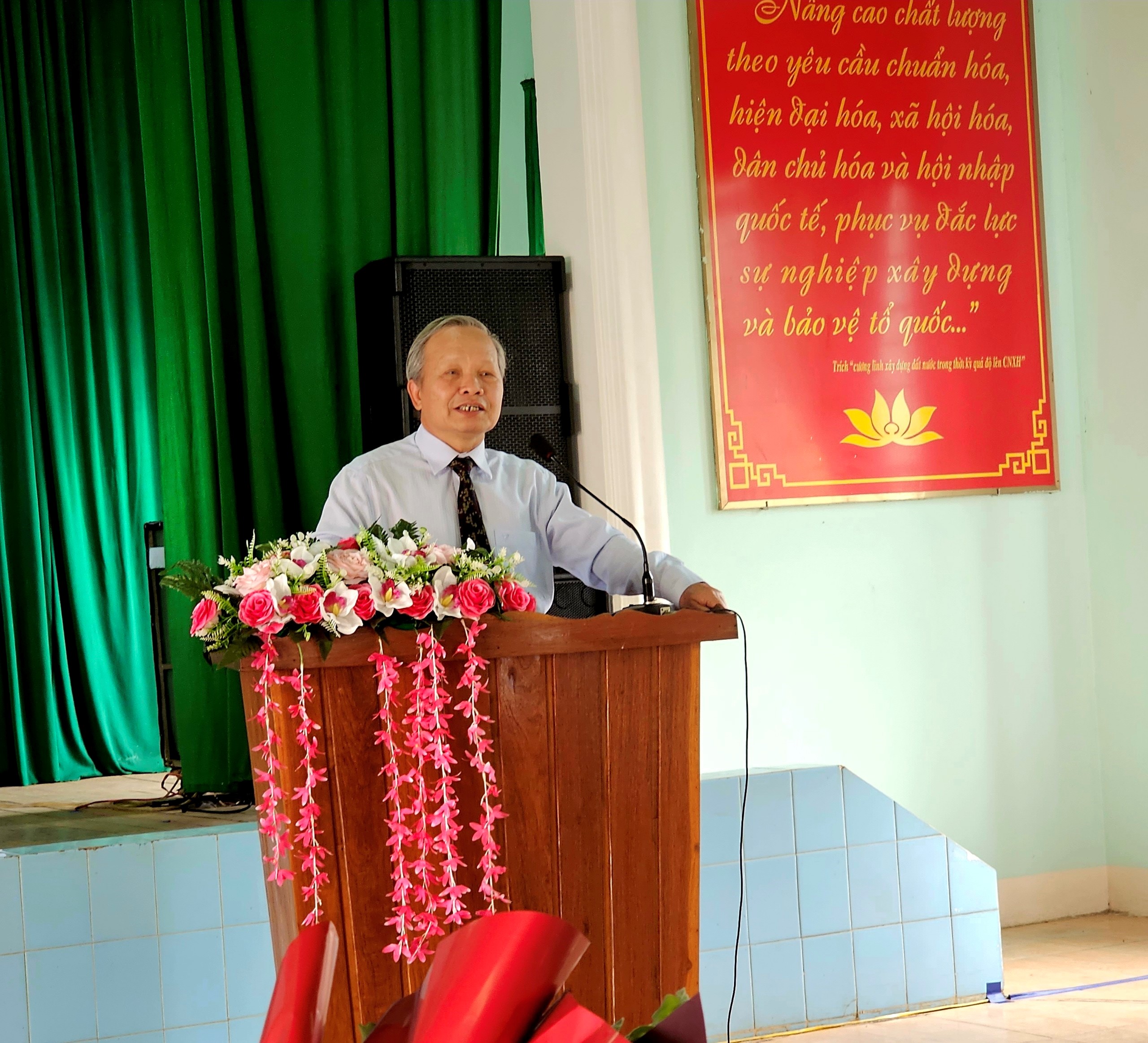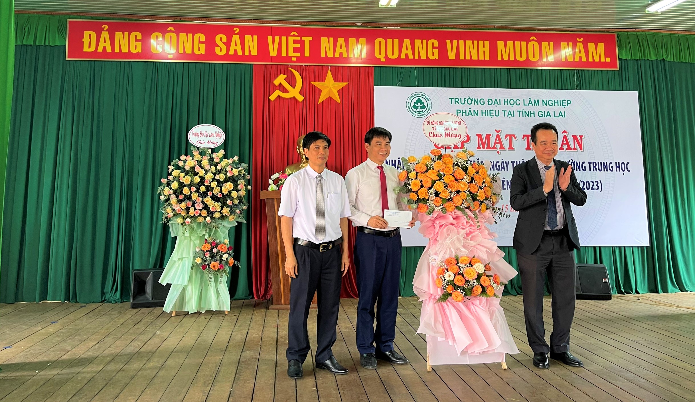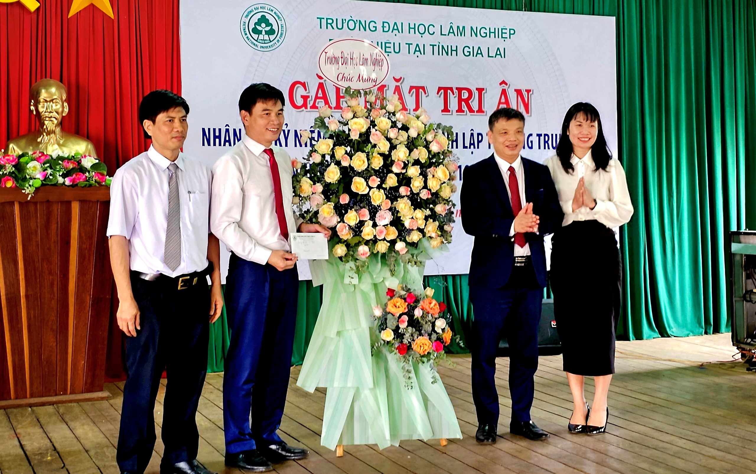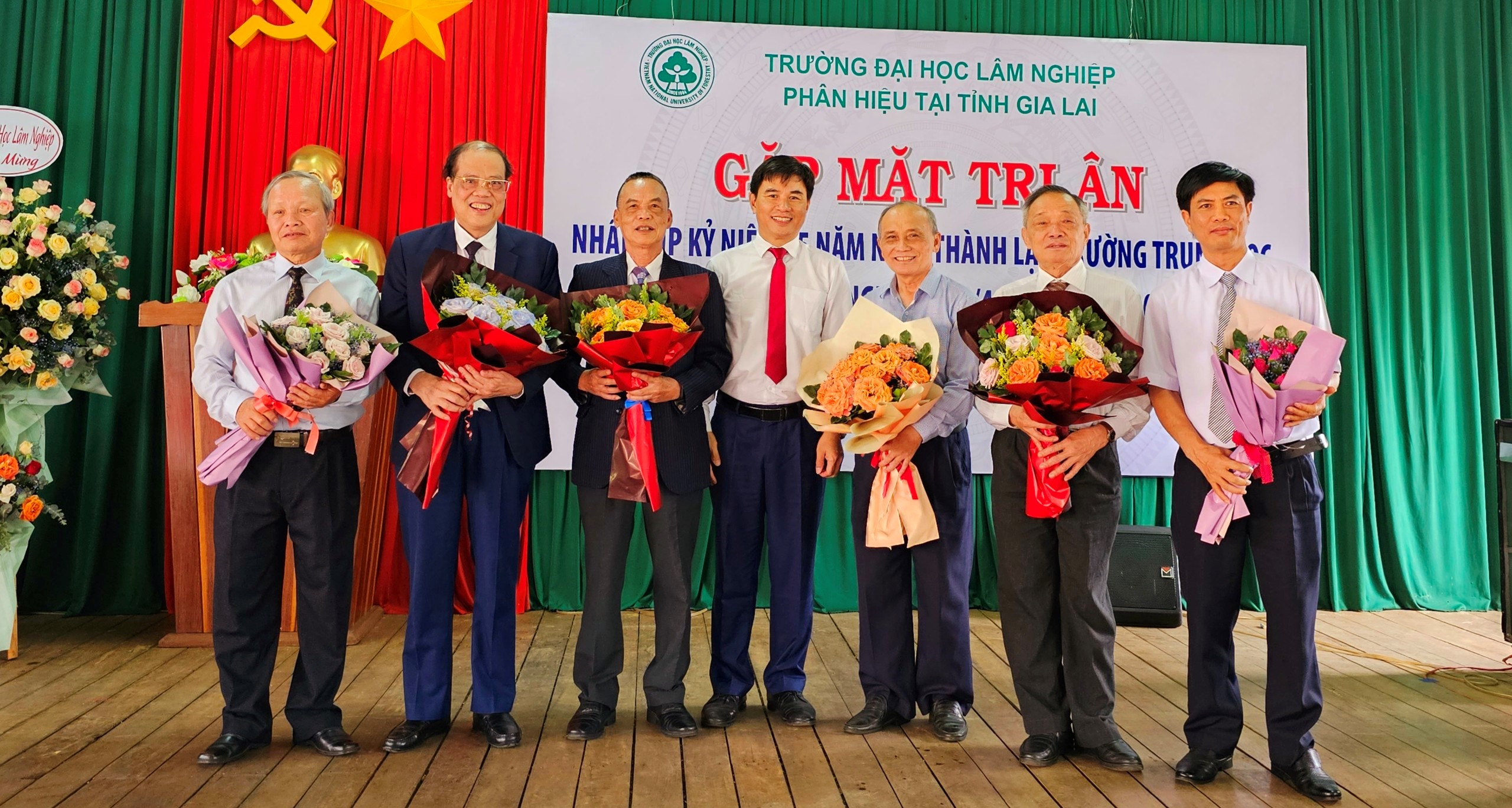 PGS.TS. Bùi Thế Đồi, Bí thư Đảng uỷ, Giám đốc Phân hiệu Trường ĐHLN tại tỉnh Gia Lai thay mặt Phân hiệu tặng hoa tri ân các thầy nguyên là Lãnh đạo Trường TCLN Tây Nguyên, Cơ sở Tây Nguyên