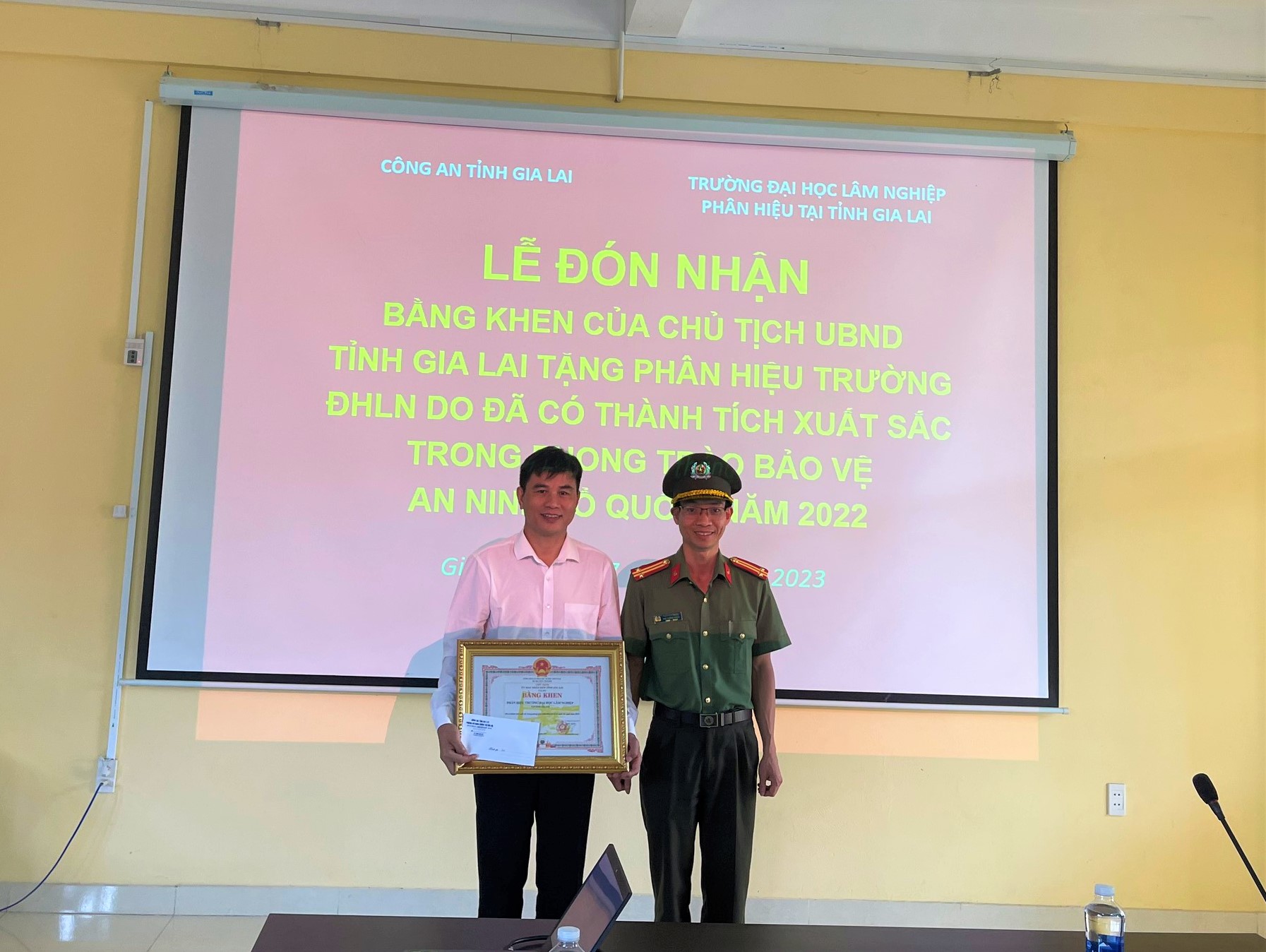 Đ/c Trung tá Trần Văn Trung, Phó Trưởng phòng PA03 tặng Bằng khen của Chủ tịch UBND tỉnh Gia Lai cho Phân hiệu Trường ĐHLN tại tỉnh Gia Lai